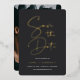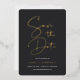 Invités Invitations à marquer leurs calendriers pour votre mariage avec ces modernes et minimes enregistrer les cartes de date. Caractéristiques de conception simple "enregistrer la date" en feuille d'or script manuscrit sur un arrière - plan noir de cendre souple, avec vos noms, date mariage, emplacement, et site Web en dessous. Ajoutez une photo fiançailles préférée orientée portrait à l'arrière.