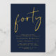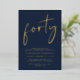 Élevez votre fête de 40ème anniversaire avec cette invitation chic bleu foncé avec "quarante" présentée dans un script élégant, votre nom dans la typographie serif élégante et les détails de la fête dans le lettrage simple et moderne, le tout rendu dans votre choix d'or authentique, feuille d'argent ou feuille d'or rose.