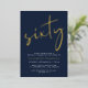 Chic blue 60th birthday party invitation that features "sixty" in a large script and your name in elegant serif typography, all rendered in your choice of genuine gold, silver or rose gold foil, and the party details in simple, modern white lettering.