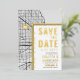 Une carte d'invitation "save-the-date" unique en vedette une carte de la ville de Chicago, Illinois. Elle comporte plusieurs caractéristiques uniques qui font une impression sur vos futurs invités, y compris les noms des mariés, le nom de la ville et les mots "Save the Date" en feuille d'or. Un symbole de cœur en feuille d'or indique votre lieu d'amour dans la ville. La carte de la ville est sur les côtés avant et arrière et peut être mise à l'échelle et déplacée. Tous les éléments de cette invitation sont déverrouillés, alors amusez-vous à être créatif et à la rendre conforme à votre style.