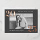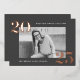 Invitations modernes de remise de diplômes avec la photo horizontale du diplômé encadrée en gris fusain avec 2025 en gras, feuille d'or rose aux coins supérieur gauche et inférieur droit. Personnalisez le devant des invitations de la fête de remise de diplômes avec le nom du diplômé et le nom de l'école. L'invitation de graduation de feuille s'inverse pour afficher les détails de votre fête en lettres blanches avec un arrière - plan gris fusain. La couleur arrière - plan peut être changée en une couleur de votre choix grâce à notre fonction d'édition. Les invitations de la fête de remise des diplômes gris charbon fonctionnent parfaitement pour les deux parties de fin d'études secondaires et collégiales.