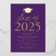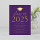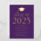 Invités Invitations pour célébrer la grade avec notre classe moderne d'invitations de la fête de remise des diplômes 2025. Les invitations ont un capuchon de graduation en haut avec "Class of 2025" en papier doré avec un arrière - plan violet. Personnalisez les invitations en ajoutant le nom du diplômé, l'école et les détails de la fête de remise des diplômes. Les invitations de la fête de remise de diplômes en feuille d'or se retournent pour montrer la photo du diplômé.