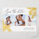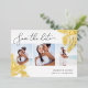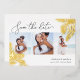 Annoncez votre été, votre destination ou votre mariage sur la plage avec ces chic tropicaux enregistrez les cartes de dates avec trois photos carrés alignées côte à côte. Des feuilles de palmiers tropicaux en feuille d'or véritable apparaissent aux coins, avec "save the date" et vos détails mariages dans un élégant mélange de script écrit à la main moderne et typographie serif traditionnelle.