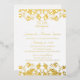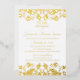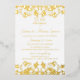 Invitation en damas doré romantique décorée en haut et en bas d'un majestueux emblème de nom doré au dos. Texte de style classique et formel et illustration dessinée à la main pour un ensemble d'invitations d'anniversaire de 50 ans unique et magnifique.