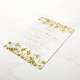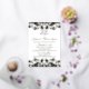 Invitation romantique en damas à feuilles d'or, ornée en haut et en bas d'un majestueux emblème de nom en or au dos. Texte de style classique et formel et ma propre illustration dessinée à la main pour un ensemble d'invitations d'anniversaire de mariage unique et magnifique.