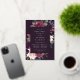L'invitation à la répétition florale chic comporte une bordure de marsala bordeaux violet, rose vif et bleu poussiéreux, avec feuillage botanique luxuriant et verdure et garniture en feuille d'or. Personnalisez avec votre mariage la répétition et les détails du dîner en lettres modernes sur un riche arrière - plan violet foncé.