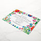 Parfait pour un événement de destination ou une soirée mexicaine, cette invitation à dîner de répétition horizontale et entièrement personnalisée présente un cadre de fleurs et de feuillage inspiré par la broderie colorée d'artisans mexicains autochtones et avec des accents brillants de feuille d'or rose en relief, le tout contre un arrière - plan blanc propre.