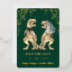 Introducing the perfect way to add a playful touch to your big day. Dinosaur Themed Wedding T-Rex Bride and Groom gold foil Save the Date Invitation. Featuring watercolor illustrations of a charming T-Rex bride and groom, this save the date wedding invitation is sure to bring smiles to your guests' faces. Gold foil script and modern typography and eucalyptus leaf foliage gold foil detailing, combines fun and elegance in one delightful design on a striking dark emerald green background.
