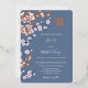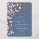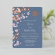 Ce faire-part de mariage chinois contemporain présente des fleurs de cerisiers roses poussiéreuses et de vrais branches de fleurs de cerisiers en feuille d'or rose, ainsi qu'un double symbole de bonheur en or rose sur un arrière - plan bleu poussiéreux. Noms de mariée et de mariée dans un élégant script manuscrit.