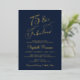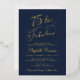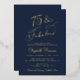 Elégante invitation de fête de 75ème anniversaire bleu foncé avec "75 & Fabulous" dans un script de calligraphie chic et les détails de la fête en lettres modernes simples, le tout rendu dans votre choix d'or véritable, argent ou feuille d'or rose.