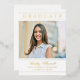 Annoncez votre diplômé en style avec cette carte de faire-part de remise de diplômes photo en feuille réelle et une invitation à la fête qui présente un design élégant à deux côtés avec deux photos senior de votre magnifique grade. Papier doré tendance aux tons noir et blanc classiques. Le dos des cartes comprend une invitation à une fête de remise de diplômes pour célébrer l'occasion.