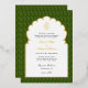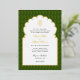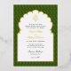 Élégante, chic Véritable invitation en feuille d'or avec le Ganesh traditionnel dans une arche dorée avec un arrière - plan en cachemire vert foncé et or, Parfait pour mariage indien.