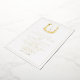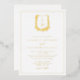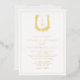 Cette élégante faire-part de mariage en feuille d'or réelle et formelle présente une magnifique crête en monogramme d'art floral en haut.