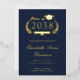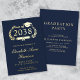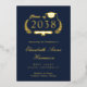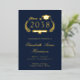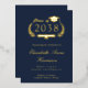Invitation de remise de diplômes de l'université moderne bleu foncé avec votre choix d'or réel, argent ou feuille d'or rose sur le devant. "Classe de" est l'illustration d'une couronne de laurier incorporant un haut casquette et un diplôme et le nom du diplômé est écrit dans un script élégant. Ajoutez leur école, leur major, leurs honneurs ou leurs futurs plans dans la typographie serif classique. Sur le dos, personnalisez les détails de votre fête de graduation en lettres d'or clair (vous pouvez changer la couleur du texte en blanc en modifiant dans l'outil de conception si vous avez sélectionné feuille d'or d'argent ou de rose pour l'avant).