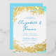 Un modèle d'invitation de mariage de plage qui présente un arrière - plan abstrait peint, expressif, aquarelle d'une grande vague de surfer en bleu tropical avec de la feuille d'or réelle et de la calligraphie moderne pour les noms. Classé et élégant, simple et moderne, il est un choix agréable pour un mariage d'été, un mariage d'escalier ou un mariage à la plage, un mariage de plage, un mariage de surf ou un mariage inspiré par le surf.