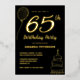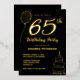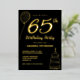 Élégante 65ème anniversaire de fête Black and Real Gold Foil Invitation avec ballon et gâteau d'anniversaire.