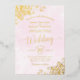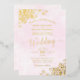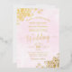 Cette belle faire-part de mariage présente à la fois l'impression de feuilles pressées d'or sur un arrière - plan rose pâle marbré. La belle conception a dentelle de calligraphie avec dentelle florale filigree dans les coins. Elégante, élégante, raffinée et chic, cette invitation est soignée et glamour. Le choix parfait pour l'élégance, le style et la classe.