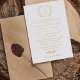 Elégant faire-part de mariage traditionnel dans une feuille d'or et la conception de typographie blanche avec un monogramme de couronne de laurier et de belles polices. Faire-part de mariage de typographie avec un monogramme verdoyant et de belles polices avec parents accueillant. Faire-part de mariage en feuille d'or monogramme avec un design typographique traditionnel et de la verdure.