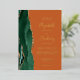 Le bord gauche de cette élégante faire-part de mariage moderne est orné d'une bordure en aquarelle vert émeraude, recouverte d'une parties scintillant en faux or. Le texte personnalisable combine l'écriture manuscrite en papier or, les polices en cuivre et en italique sur un arrière - plan orange brûlé. L'envers est assorti d'une agate vert émeraude et or.