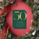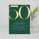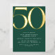 Invitations modernes de 50ème anniversaire avec un grand cap "50" en véritable feuille métallique. Les détails de votre événement sont imprimés ci-dessous en caractères blanc mat. Feuille d'or sur un arrière - plan vert émeraude.