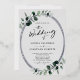 Eucalyptus Calligraphie Pastel Grey Photo Mariage Real Silver Foil Invitation... L'avant de notre luxueux faire-part de mariage botanique présente un cadre ovale en feuille d'argent, agrémenté de feuilles d'eucalyptus gris émeraude et gris sur un arrière - plan gris pastel. L'arrière de l'invitation affiche votre photo de mariage 5x7. Tous les exemples de texte (mis à part les éléments de calligraphie graphique) peuvent être facilement révisés avec vos propres informations sur le modèle de personnalisation.