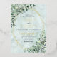 Impressionnez vos invités avec cette élégante invitation de mariage, avec des bouquets toujours populaires de verdure d'eucalyptus et un cadre géométrique imprimé avec REAL GOLD FOIL, ainsi que les noms de la mariée et mariée et la date mariage. L'arrière - plan est en marbre vert sauge poussiéreux.