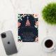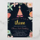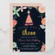 Les invitations adorables pour le troisième anniversaire de votre animal sauvage comportent une bordure florale de saumons et une illustration de tipi rose. "Jeune, sauvage et trois" apparaît en feuille d'or, avec les détails de votre 3ème anniversaire de fête en dessous, sur un riche arrière - plan bleu marine accentué avec garniture de feuille d'or.