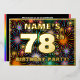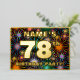 Le recto de ce modèle de carte d'invitation en feuille pour une célébration d'anniversaire soixante-dix-huitième anniversaire amusante et entraînante comporte un nom modifiable, un grand nombre « 78ème », le message « FÊTE D'ANNIVERSAIRE ! » et une bordure. Le fond du recto présente un motif joyeux et multicolore inspiré de feux d'artifice de célébration explosant. Le verso comporte des détails personnalisés sur l'événement, tels que la date, l'heure, le lieu/l'endroit, et toute autre information importante. Les invitations modifiables comme celles-ci pourraient être une façon amusante d'inviter les participants à une fête/réunion d'anniversaire organisée pour honorer les 78 ans de quelqu'un.