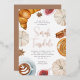 Invitations invités pour un élégant brunch de douche nuptiale automne ou automne avec ces belles invitations aquarelles. Le design présente les détails de votre célébration en lettres modernes, entourés d'illustrations de viennoiseries, croissants, café, figues, citrouilles blancs, cannelle et anis dans des tons chauds de terre avec des accents roses de feuille d'or et de lettrage.