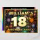 La façade de cette audacieuse carte d'invitation pour fêtes/fêtes d'anniversaire comporte un nom personnalisé, un grand numéro "18e", le message "FÊTE D'ANNIVERSAIRE !", et une frontière. L'arrière - plan du front a un motif amusant et multicolore qui ressemble à un feu d'artifice festif. Le verso présente des détails personnalisés sur l'événement, tels que la date, l'heure, le lieu et toute autre information utile. Des invitations personnalisées comme celles-ci pourraient être une façon amusante pour les invités invitations d’une fête d’anniversaire organisée pour célébrer le 18e anniversaire de quelqu’un. [~Z0000602]