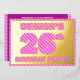 La façade de cette carte d'invitation amusante et audacieuse de fête de vingt-sixième anniversaire comporte un nom modifiable, un grand numéro "26e", le message "FÊTE D'ANNIVERSAIRE !", et une bordure, toutes avec un motif rayé rose clair et rose foncé féminin. Le verso présente des détails personnalisés sur l'événement, tels que la date, l'heure, le lieu/lieu et toute autre information pertinente. Des invitations modifiables comme celles-ci pourraient être utilisées pour les participants invitations ou les invités à un rassemblement d’anniversaire qui se tient pour célébrer le 26e anniversaire de quelqu’un. [~Z0000597]