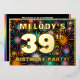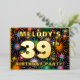 La façade de cette carte d'invitation à fêtes de trente-neuvième anniversaire joyeuse et vibrante comporte un nom personnalisé, un grand numéro "39e", le message "FÊTE D'ANNIVERSAIRE !", et une frontière. L'arrière - plan du devant est doté d'un motif optimiste et multicolore qui ressemble à un feu d'artifice festif éclatant. Le verso présente des détails personnalisés sur l'événement, tels que la date, l'heure, le lieu et toute autre information importante. Des invitations customisées comme celles-ci pourraient être une façon amusante pour les invités invitations à une fête d’anniversaire organisée pour célébrer le 39e anniversaire de quelqu’un. [~Z0000602]