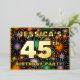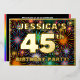 La façade de cette carte d'invitation à fêtes de quarante-cinquième anniversaire captivante et passionnante comprend un nom personnalisable, un grand numéro "45e", le message "FÊTE D'ANNIVERSAIRE !", et une frontière. L'arrière - plan du devant présente un motif joyeux et multicolore, inspiré de feux d'artifice festifs éclatants. Le verso présente des détails personnalisés sur l'événement, tels que la date, l'heure, l'emplacement et toute autre information importante. Des invitations customisées comme celles-ci pourraient être une façon amusante pour les participants invitations à une fête d’anniversaire ou à une réunion organisée pour célébrer le 45e anniversaire de quelqu’un. [~Z0000602]