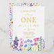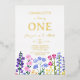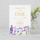 Une invitation botanique de printemps vibrante et amusante pour le premier anniversaire mettant en vedette des fleurs sauvages en bas du design. Tout le texte est en feuille d'or. Cette invitation est idéale pour une fête de jardin de printemps ou d'été. Customisez-le pour votre petite fille aujourd'hui. Voir l'ensemble de la collection de fêtes de correspondance. Toutes les oeuvres sont illustrées à la main par Kaitlyn Thomas et protégées par copyright.