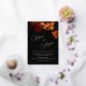Colorful painted flowers and bride and groom names in an elegant classic calligraphic script on a black background wedding invitation.