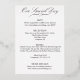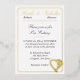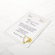 Il s'agit d'un faire-part de mariage de 5' x 7'', montré en blanc élégant avec des accents de feuille d'or. Il s'agit d'une véritable garniture en feuille, disponible en or, argent et or rose. Les accents de feuille comprennent le nom de la mariée et du marié, un coeur fantaisiste et une ligne horizontale, un design de coeur et de rose, et un contour de feuille sur l'avant. l'arrière comprend un motif "Notre journée spéciale", avec des détails sur le mariage.