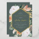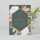 L'élégante invitation à la fête de graduation florale présente un cadre hexagonal allongé dans une étonnante feuille d'or, bordée de fleurs d'aquarelle et de feuillage dans des tons de pêche inspirés du désert de saumons, blanc, ivoire et vert sauge sur un arrière - plan vert forêt moody. Personnalisez avec les détails de votre grand parti en serif classique et en écriture de script avec des accents de feuille.