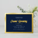 Cette élégante invitation Grand Ouverture présente un design accentué par un script en feuille d'or et une bordure en feuille d'or sur un arrière - plan bleu foncé.