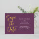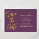 Ces cartes de dattes ont un design moderne et élégant sur un arrière - plan prune violet. "Save the Date" est imprimé en feuille d'or, avec une grande police dans un script, style manuscrit. Les informations sur le mariage ou l'événement sont imprimées à droite.