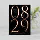 Cette carte de date moderne et audacieuse comporte la date de votre mariage en chiffres très grands en format rose réel en feuille d'or sur un arrière - plan noir. Les noms du couple et l'emplacement du mariage sont affichés à l'intérieur du zéro pour les mois de janvier à septembre et à gauche du numéro un pour les mois d'octobre à décembre. Ce chic enregistrer la carte de date fera une déclaration et donne le ton pour votre mariage. L'arrière de la date d'enregistrement a de l'espace pour une photo pleine page.