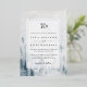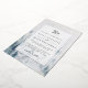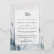 Élégante invitation de mariage hivernal, un arrière - plan d'aquarelle représentant un paysage de montagne enneigé parsemé de pins dans les nuances brumeuses de bleu et de gris. Personnalisez avec vos détails mariages en lettrage doux et doux, surmonté de votre monogramme ou de votre duogramme, accompagné d'un esperluette décoratif. Un beau choix pour des mariages d'hiver élégants en montagne ou en forêt. La garniture en feuille d'argent complète le design pour un look luxueux.