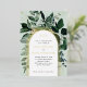 Invitations de mariage dans le jardin botanique de verdure moderne. Cette élégante faire-part de mariage voûtée est un choix idéal pour les mariages d'été ou de printemps du jardin extérieur. Caractéristiques peintes aquarelle feuilles botaniques avec des cadres modernes voûtés et initiale de la mariée et du marié dans une belle feuille d'or. Faites de ces invitations de mariage Garden une invitation élégante et unique qui donne une première impression à vos invités.