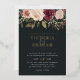 Des invitations à un mariage floral chic ou des mariages d'automne ou d'hiver présentent vos détails en lettres blanches sur un riche arrière - plan noir aux accents dorés et élégants. Un jet de roses d'aquarelle, de mamans et de verdure orne le sommet, dans des couleurs automnales rustiques, comme la pêche, l'ivoire, le rougissement, le bordeaux et le vert. Un design moderne et élégant pour des mariages rustiques chic en automne ou en hiver.
