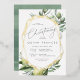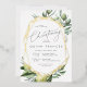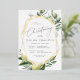 De belles invitations à baptiser le thème de la nature pour le printemps ou l'été présentent des lettres grises encadrées par une bordure géométrique en feuille d'or et des illustrations délicates en aquarelle de verdure méditerranéenne, feuilles, olives et citrons. Personnalisez avec vos détails de cérémonie et de célébration de l'église. Un choix moderne dans une palette de couleurs naturelles pour des événements à thème boho ou nature.