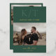 Mariage moderne enregistrer la carte de date avec un design chic et contemporain avec un agencement minimal. En haut se trouve votre monogramme dans un grand format en gras avec vos noms. Au milieu est votre photo horizontale préférée et ci-dessous sont "enregistrer la date" dans un script élégant et votre date mariage. Le dos a une deuxième image horizontale avec des détails supplémentaires. La palette de couleurs est vert chasseur avec vos détails en papier d'aluminium, ce qui fait enregistrer la carte de date super pour un automne / automne ou un mariage d'hiver et peut être mis à jour à toutes les couleurs que vous choisissez dans l'outil d'édition de conception.