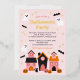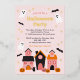 Conception de carton d'invitation personnalisé en feuille de Halloween avec des maisons hantées, des citrouilles, des fantômes, des chats noirs et des chauves-souris, que vous pouvez personnaliser avec vos propres détails d'événement.
