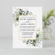 Invitation de mariage élégante et moderne comprenant de la verdure botanique, des feuilles d'eucalyptus et des feuilles bleu poussiéreux. Cadre en feuille d'or. Dos photo.