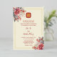 Ce faire-part de mariage chinois moderne est doté d'une véritable feuille d'or double symbole de bonheur et d'aquarelle peinte fleurs roses sur un arrière - plan crème. Le côté arrière a le même ton rouge que le script. Veuillez cliquer sur "modifier la conception" si vous voulez changer le côté arrière en blanc.