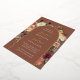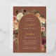 D'élégantes invitations à des mariages fleuris ou des mariages d'automne ou d'hiver présentent vos détails encadrés par une arche de roses d'aquarelle, de mamans et de verdure aux couleurs d'automne rustiques, y compris pêche, ivoire, rougissement, bordeaux et vert, avec des garnitures en feuille d'or et des scripts de calligraphie d'or sur un arrière - plan de rouille en terre cuite. Un design moderne et élégant pour des mariages rustiques chic en automne ou en hiver.