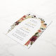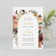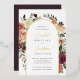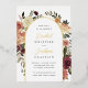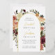 D'élégantes invitations à des mariages fleuris ou des mariages d'automne ou d'hiver présentent vos détails encadrés par une arche de roses d'aquarelle, de mamans et de verdure aux couleurs d'automne rustiques, y compris pêche, ivoire, rougissant, bordeaux et vert, avec des garnitures en feuille d'or et des scripts de calligraphie en or sur un arrière - plan blanc. Un design moderne et élégant pour des mariages rustiques chic en automne ou en hiver.